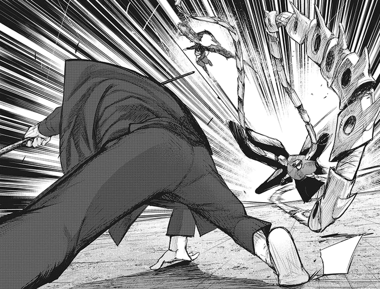 Saat menyerang anggota CCG, dan memakannya, badan Kaneki beregenerasi dengan sangat aneh. Bentuknya sekarang mirip binatang kelabang yang besar, sama mirip motif Ghoul miliknya.